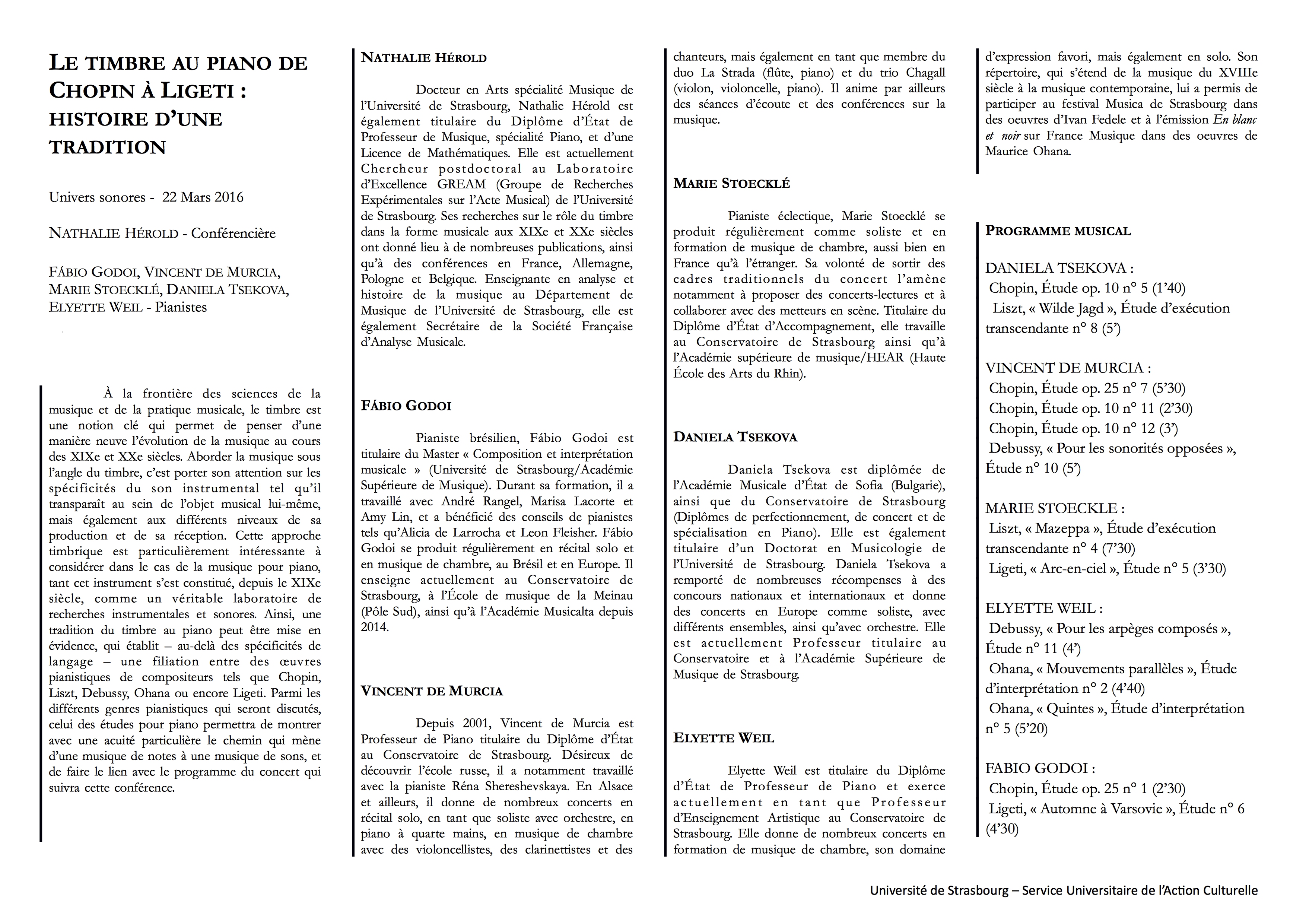 Univers sonores – Strasbourg University cycle – concert (with pianists Vincent de Murcia, Marie Stoecklé, Daniela Tsekova and Elyette Weil) preceded by a conference (in french) by Nathalie Hérold, “Le timbre au piano de Chopin à Ligeti : histoire d’une tradition”.